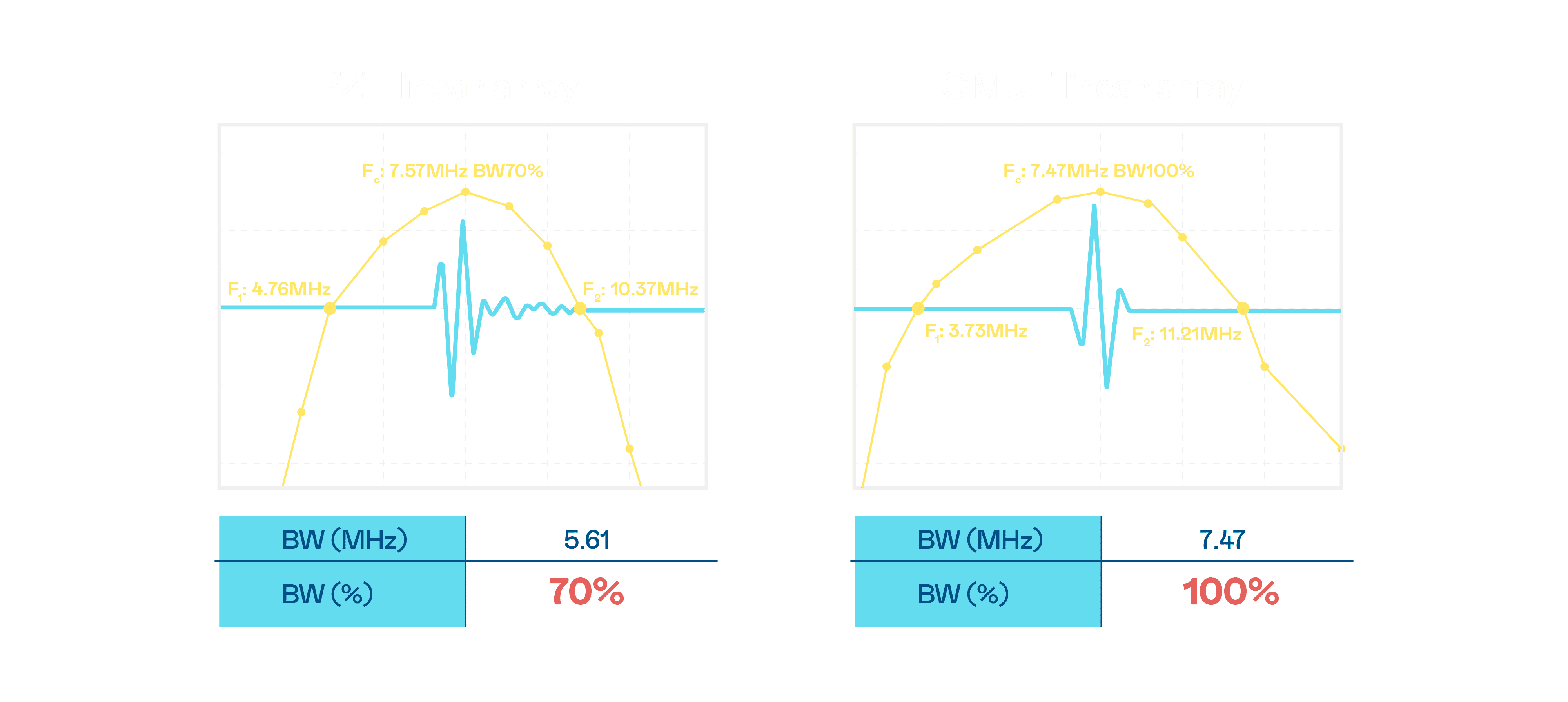 超音波影像的解析度高低,,,首先取决于探头能发出的讯号频宽。。。菠菜论坛 CMUT 可提供高清晰的超音波讯号,,,提供高频宽、、、高灵敏度、、、影像纹理细节更高的超音波影像,,协助医护人员缩短影像判读时间及利用精准的医疗影像进行诊断。。。。